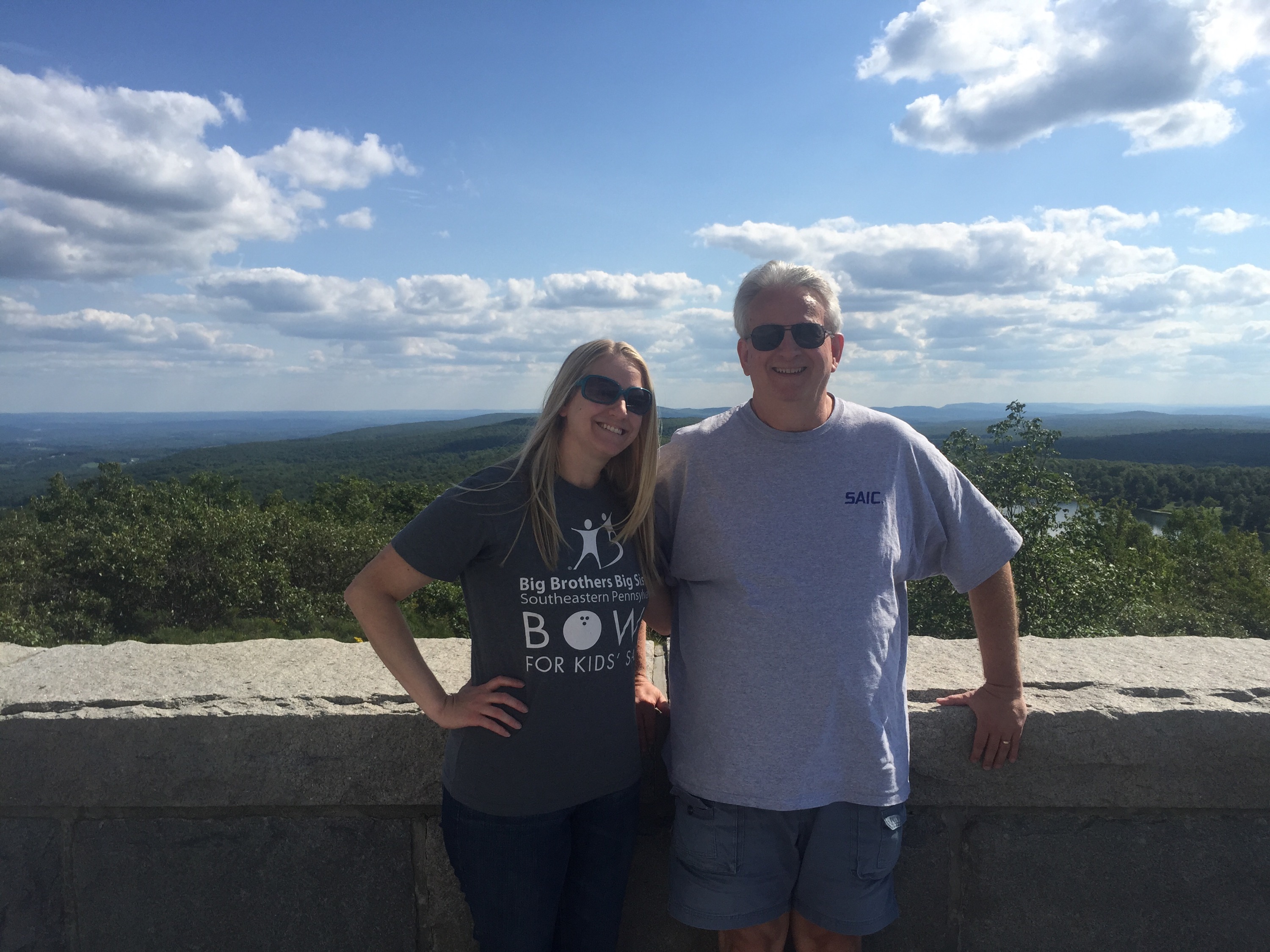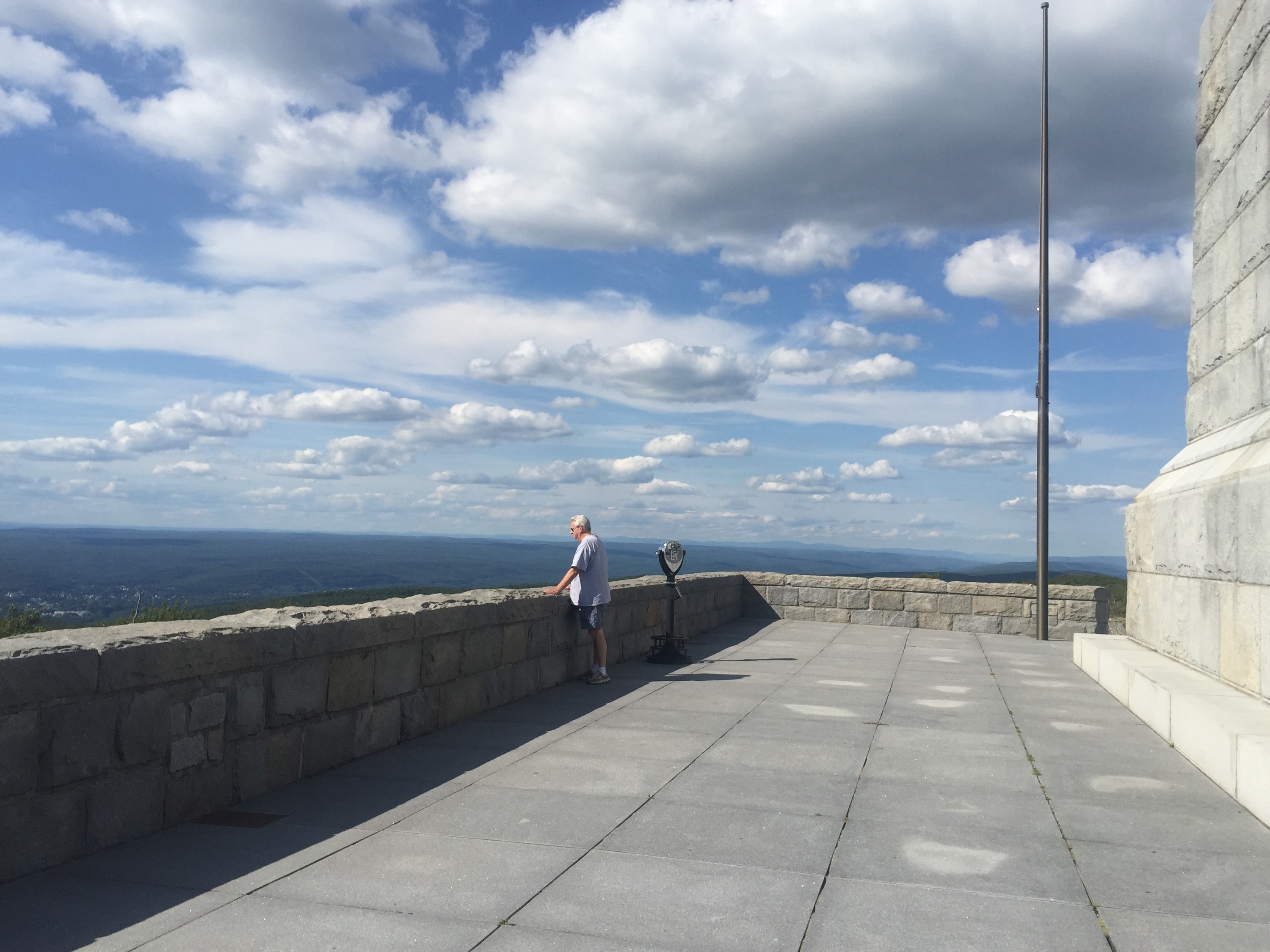 We arrived at the New Jersey high point, jumped out to snap a few pics- Deja Vu took a few of my Dad and I and I exclaimed “SEE?!? It’s good we brought you along!” 🙂 haha! You could not have asked for better weather – and the view was gorgeous!! The monument was closed for construction so we couldn’t climb to the top, but that was ok- we started talking to Deja Vu about where he was heading and after looking at a map we realized it was not that far off from where Dad and I were going–so we decided to take him the whole way! Lucky for him we were heading that way, lucky for us we got more awesome stories along the way!