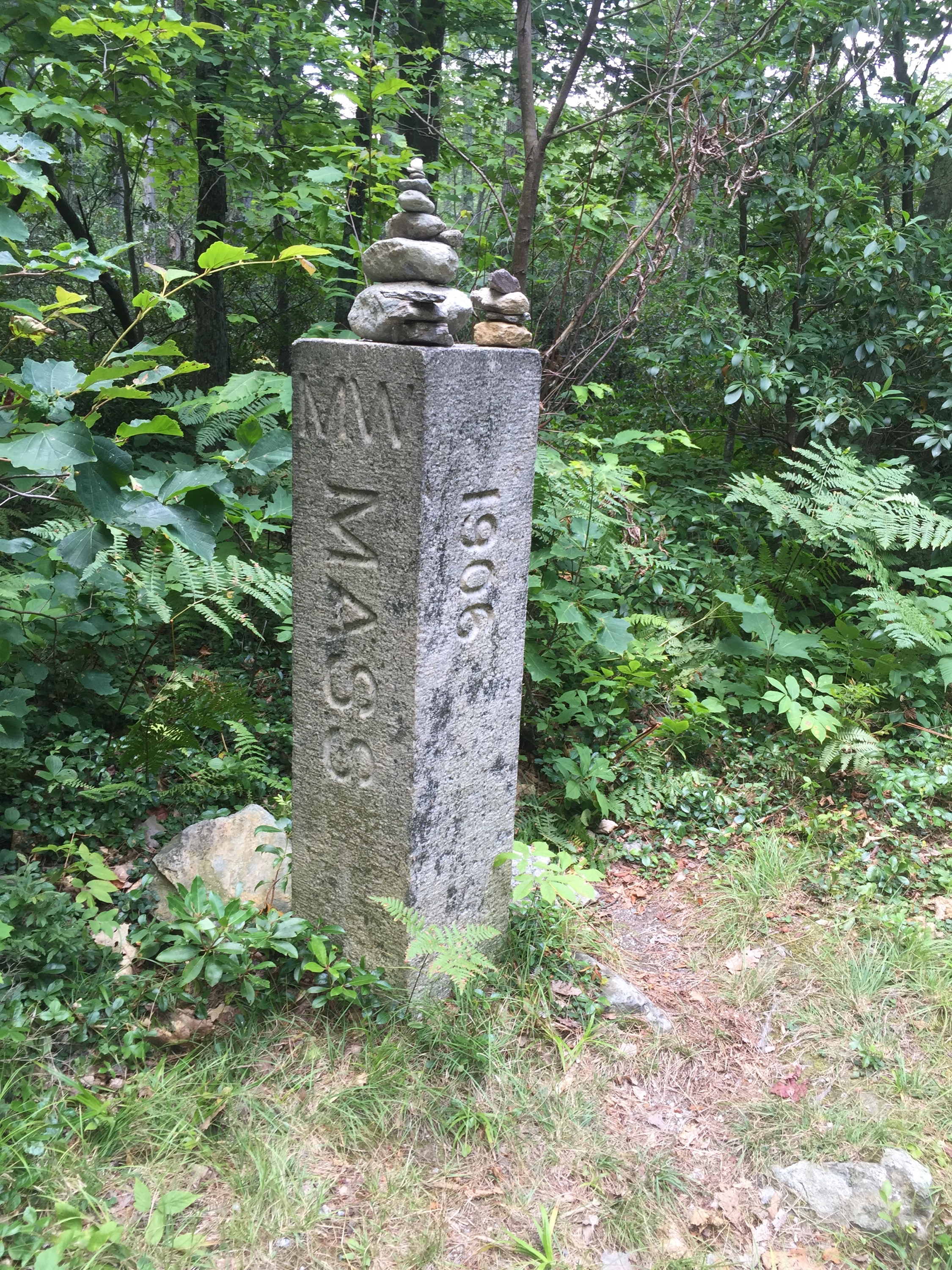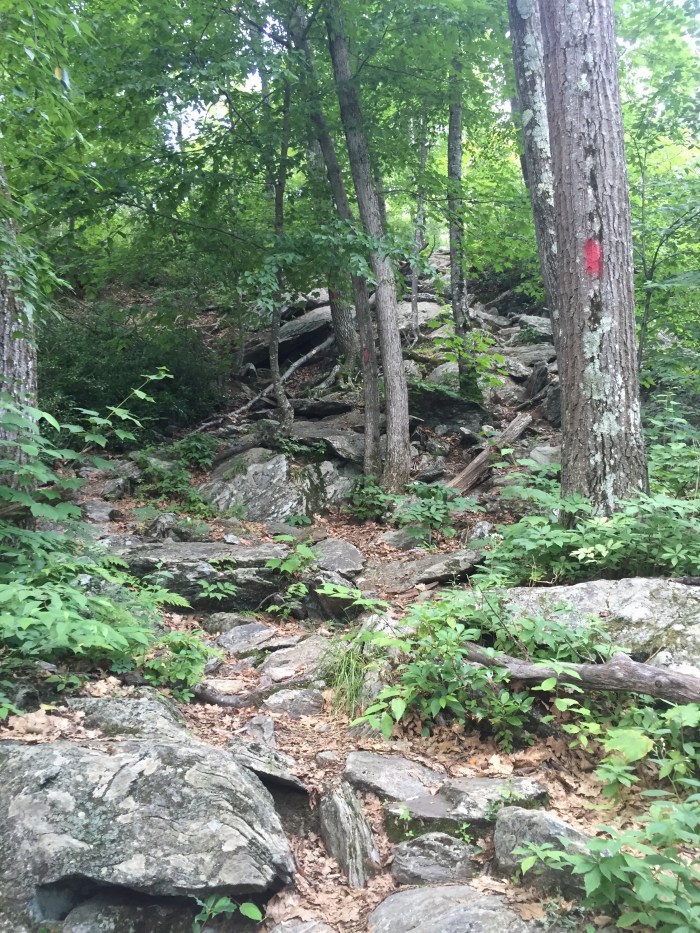 We almost missed the tiny parking lot, but I remember reading online and seeing pictures that there is a little monument for MASS and CT state line near the parking lot and the trailhead was across from that- so we turned around and found it. We both started hiking along the red blazed trail. It was a little overgrown in places and slightly rocky but not horrible–at 1st. We ran into some people heading back to the parking lot and told us to get ready for a rock scramble ahead. My dad decided to turn around shortly after that- I was not sure what to expect, but I continued on.