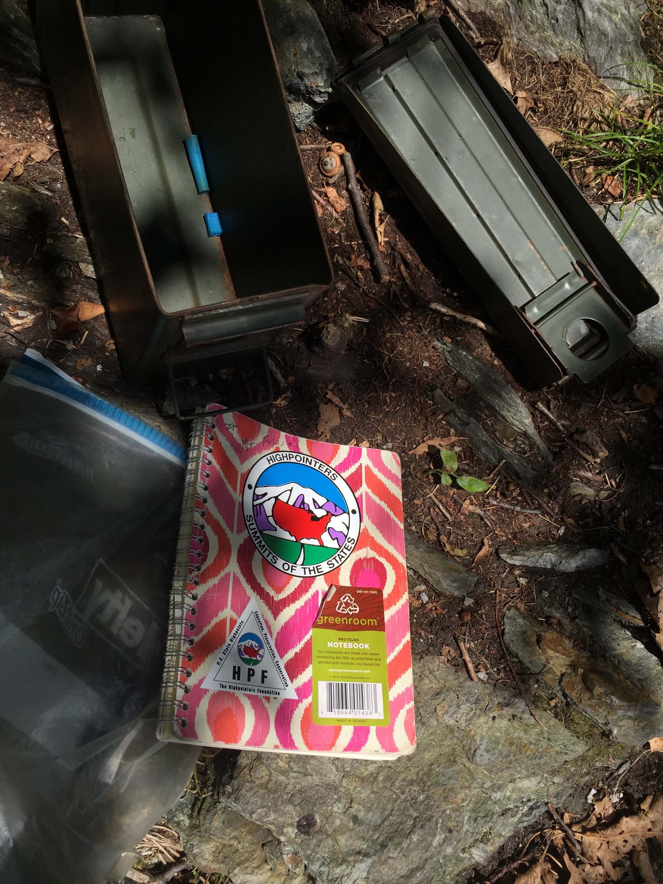 We chatted for a bit- turns out his hobby is hunting for rattlesnakes to photograph! I asked him where exactly the highpoint of CT is and he told me I was very close- just a few minutes walk and I would see it. He told me to keep looking to the right- I’m glad he did because I was sure I would have missed it otherwise!! It was literally under a tree branch! I signed the log book, shoved it back in the box, and hurried back down the trail hoping to catch up with the man and his grandsons- time goes by faster when you’re chatting and they seemed nice enough! A little way down the trail I spotted them- they asked me if I actually made it to the summit of Mt Frissel- I said no I couldn’t find that. He explained I was close and should go back to check it out- the sign wasn’t very visible on the trail. As soon as he said that I figured it was where it looked like a little trail went but no blazes. I rushed back to check it out. I walked down the path I skipped earlier- and there it was, just a few steps down the trail! Bright yellow sign that stated it was the summit of Mt Frissell- I snapped a few pics, and tried to open the metal box that housed the register- no luck!! I couldn’t get it to budge!! Oh well-I took pics and that was enough for me- I was definitely ready to get off this damn mountain!!
