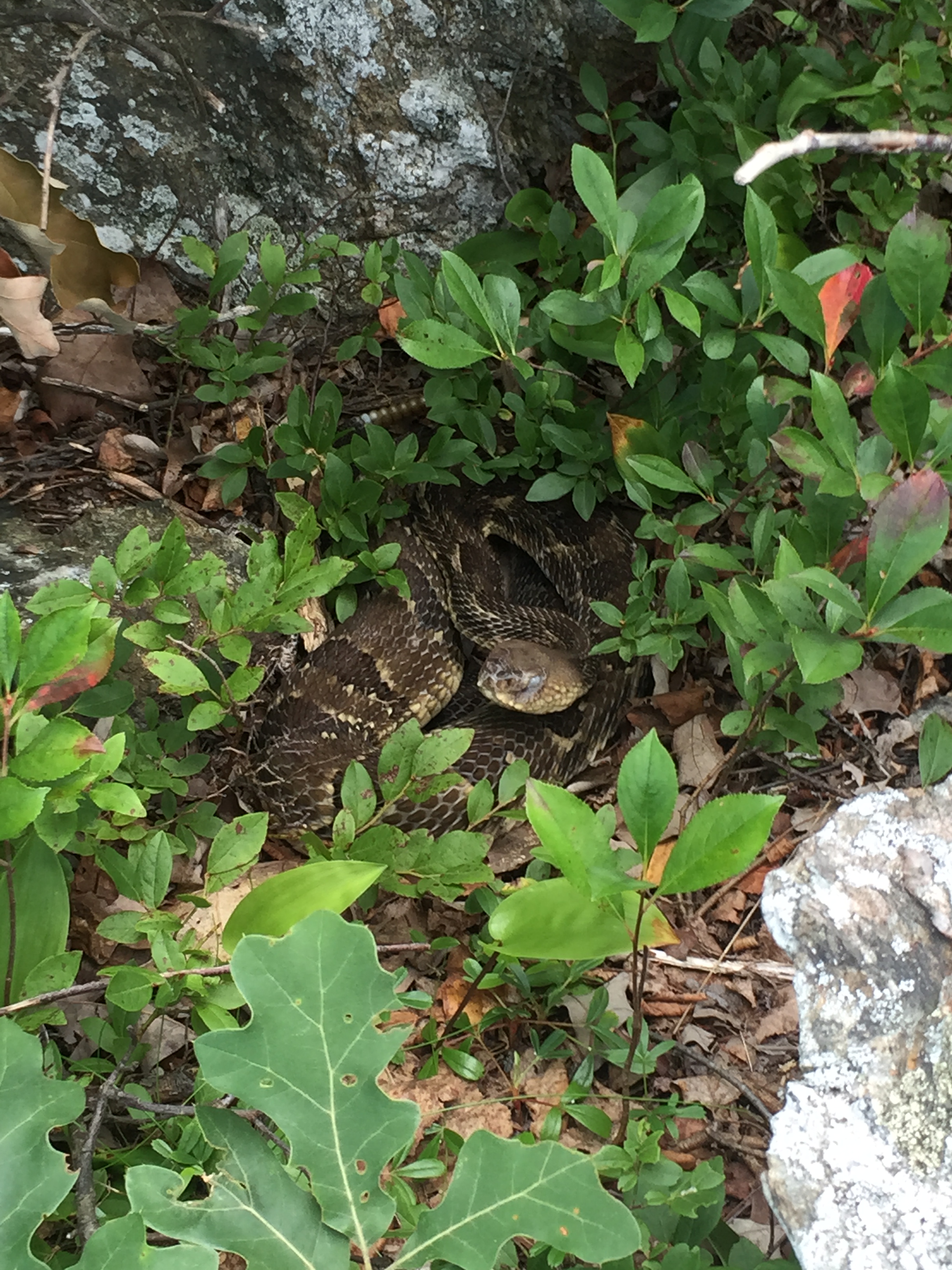 I caught back up to the guys who were on the search for rattlesnakes and we started to head down Mt Frissell and before I knew it we were back on the top of Round Mtn! It really helps to take your mind off how steep it was when you’re chatting! They kept jumping off the trail to check for snakes periodically and wouldn’t ya know they actually found one! So I headed over to take a pic- it never once rattled!