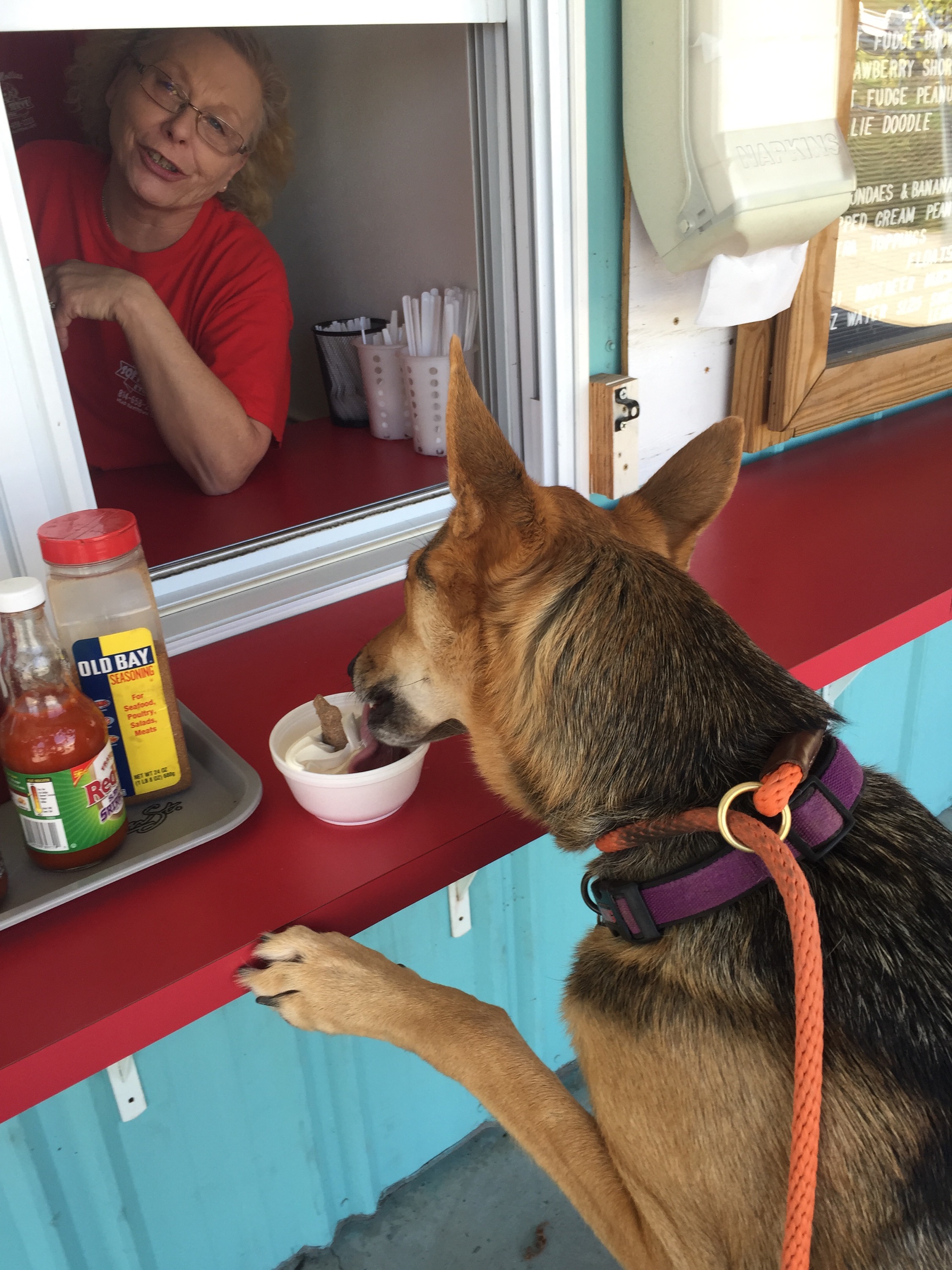 So we put her ice cream down and she gobbles it up- we grab ours and go over to the tables to sit down. This lady and her daughter shows up- Jo started barking at them, but quieted down when they finished ordering. The lady says to me, “We would like to sit at a table under the shade- is that going to be a problem?” I was in shock and Kevin’s mom says, “no – there’s tons of tables under the shade- take your pick!” To which the lady replied, “are you sure?? Because….” And points at Jo, looking her up and down like she’s a ferocious killer- meanwhile Jo is just standing there not even paying attention to them. I nod my head at them and they go and sit down. I honestly understand that not everyone likes dogs and people are especially afraid of German Shepards so I get upset when she’s not on her best behavior- I want her to change people’s minds about German Shepards, but even dogs get cranky sometimes- and this was one of those days.