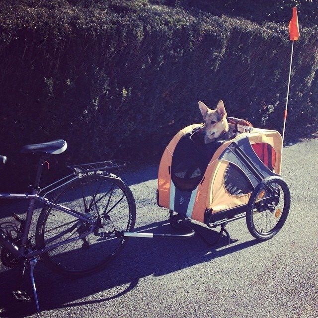 So last year I bought a DoggyRide for JoJo – for those of you unfamiliar with what that is, it is one of those carts that attaches to your bike that you put a kid in, only this is for dogs. There are multiple openings that she can stick her head out, or I can zip the whole thing up and she just lays down and enjoys the ride. There is a strap with a clasp inside that I attach to her harness which is supposed to prevent her from jumping out, although she did jump out the 1st time I took her on a ride. Sure, she looks cute in it, but what ELSE can I use it for?