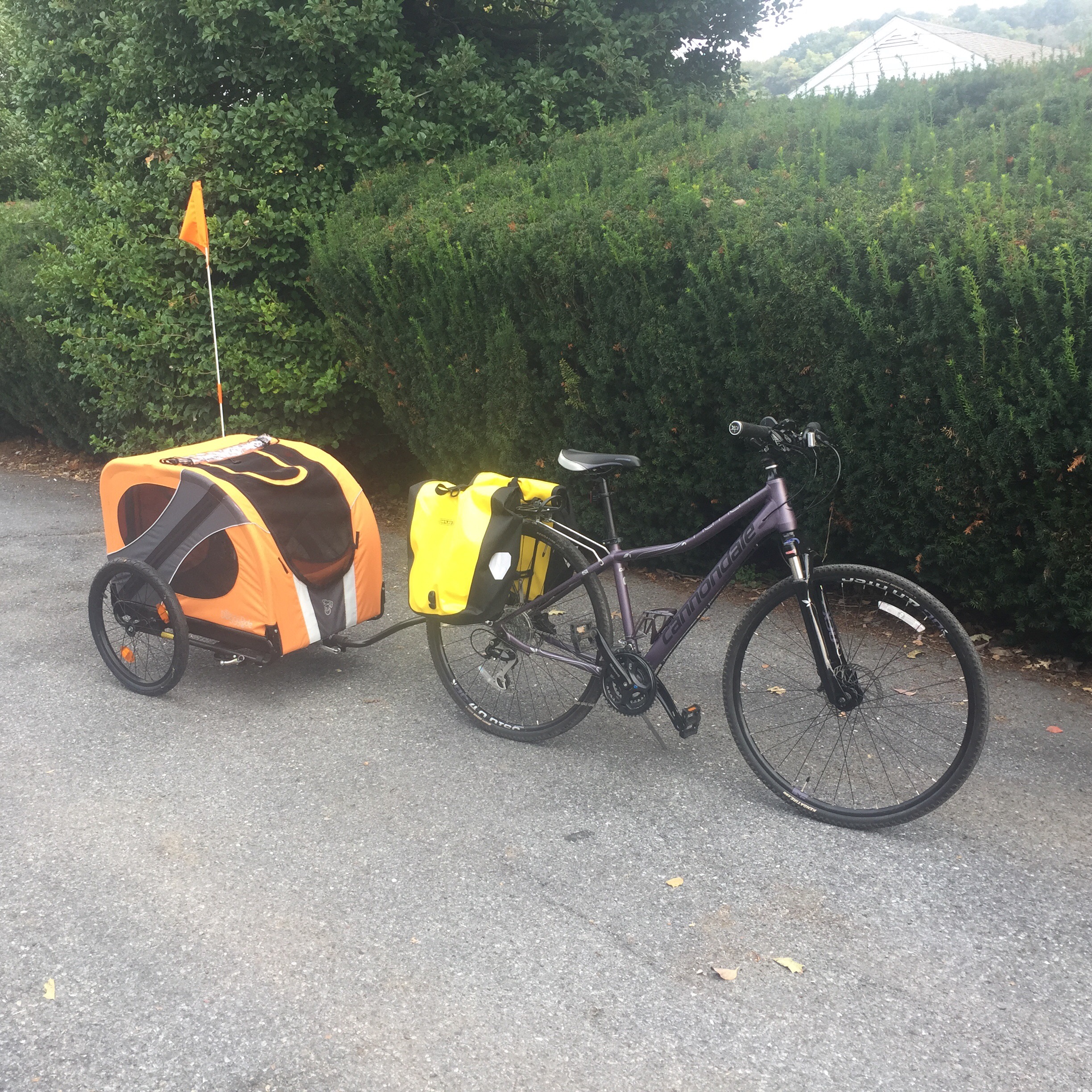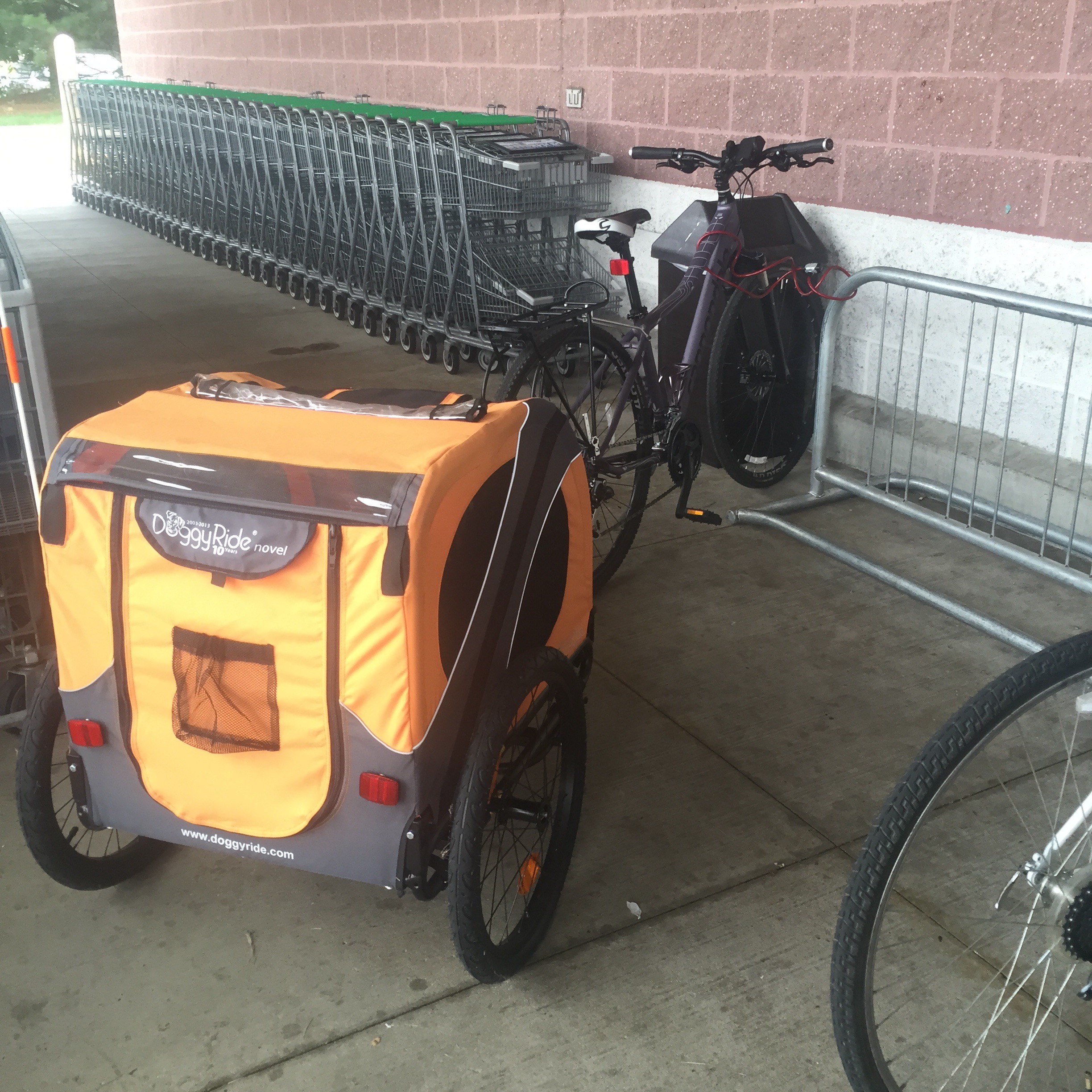 Well, today I needed to go grocery shopping, which I HATE doing – so why not combine it with something I LIKE doing, riding my bike? I hooked up the DoggyRide, grabbed my Ortlieb panniers and off I went. It is about a mile to the nearest grocery store, so that’s not bad at all, although I do have to cross a fairly busy road on the way, which makes me a little nervous.