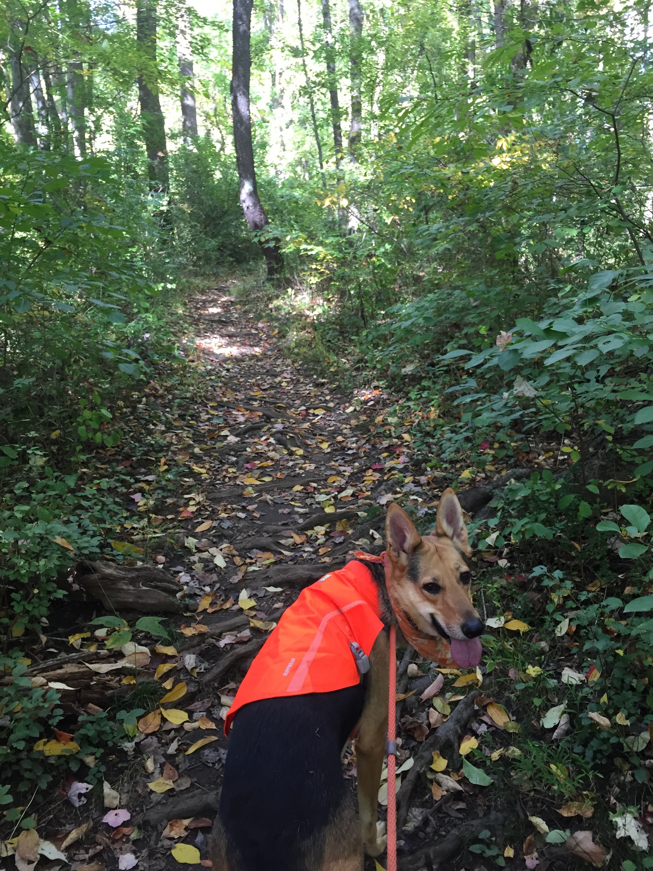 At a confusing spot, there was a white arrow painted on a tree pointing to the right – there was a narrow trail going in that direction, but also a trail going straight and to the left. We followed the blaze and it took us to a little tunnel thing that went under the multi use trail. It was very overgrown in that area. As I stood there wondering aloud about where the trail went and “Are we really supposed to go through that? It looks too low! There is a ton of weeds to walk through – that can NOT be the trail, can it?” and blah blah blah, I look up to see an older man walking along the multi use trail looking at me like I’m a complete lunatic. I just shrug and say, “OH! haha – Just talking to my dog.” He nods and says, “I talk to mine too!” 🙂 hahaha I don’t think he could see Jo at first because the brush was so high, but I was glad I started chatting to him because when I looked up I noticed a blaze across the street! So we didn’t have to go in that tunnel after all! We also could have just gone straight where the blaze pointed right. When we crossed the road I didn’t see where the narrow trail would have come out from under the tunnel, so I was really glad we didn’t try to take that! I didn’t snap a pic of the tunnel as I was slightly embarrassed at being caught talking to myself/JoJo. 🙂